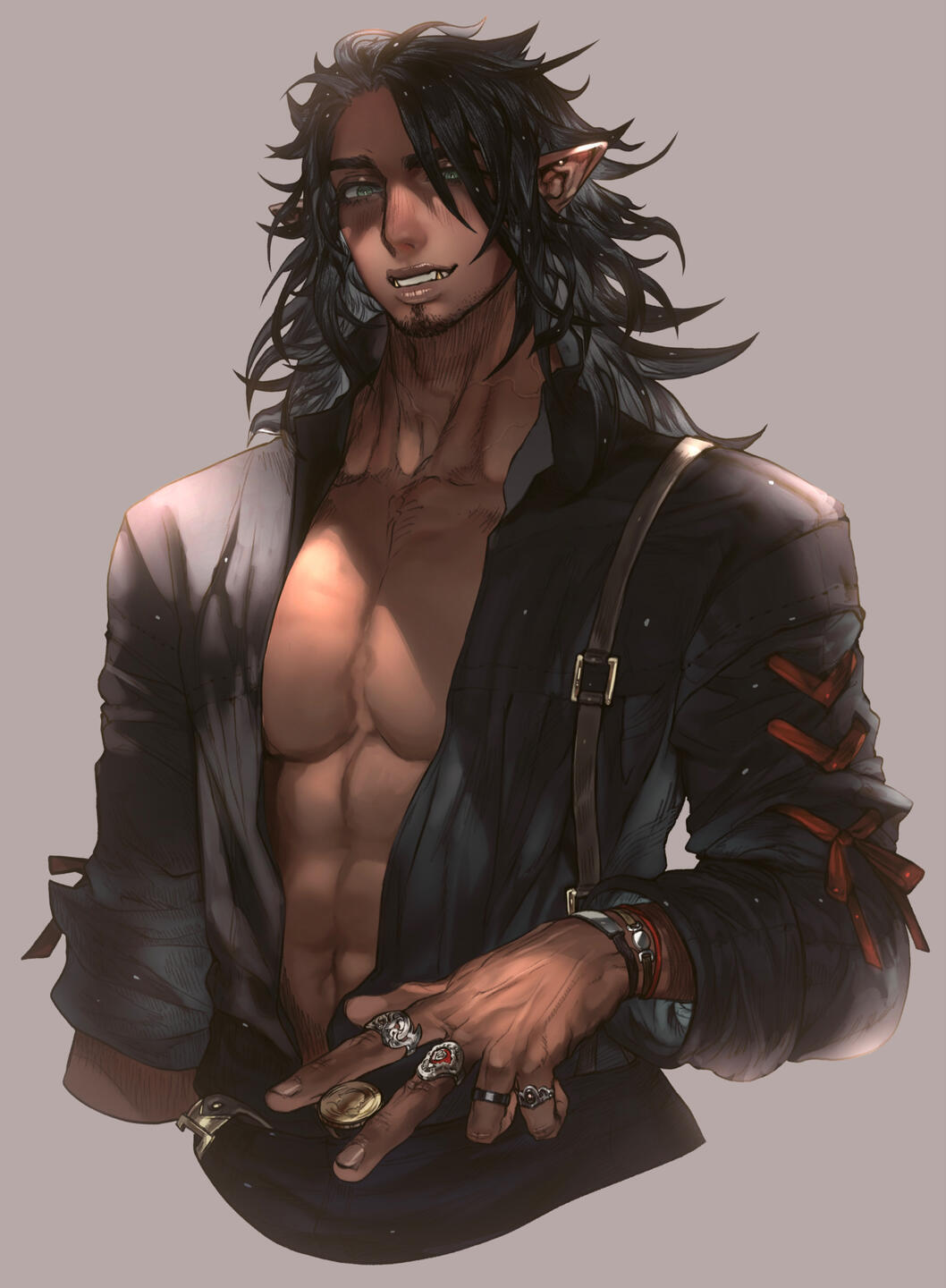 FULL NAME: Regis "Rex" JackdawTRUE NAME: ???ALIAS(ES): Rex, Jack, GrimSEX: MaleSEXUALITY: No preferenceAGE: 54RACE: Pureblood Xaela Au RaMORAL ALIGNMENT: Lawful EvilOCCUPATION(S): Explorer, solo adventurer, Sky Pirate Captain (retired), smuggler (retired), dealer (retired), fence (retired), assassin (retired), information broker (retired).APPEARANCE: Tall (7'1'' / 216cm), broad. Barrel-like torso with thick, solid, functional muscle. Off-season dad bod. Massive, razor-backed tail; ruby underbellied scales. Four hundred and thirty ponze, one hundred of it is his tail. Proceed with caution. Covered in various scars, most notably a deep slash on the lefthand side of his lips.NOTES: Smells like fresh coffee and gunpowder. Unmatched sense of smell, taste, hearing. Wears reading glasses. Temperament of a crocodile.